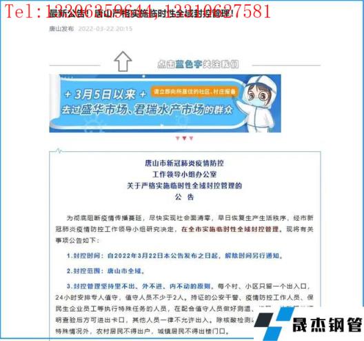 3月22日20時許,唐山發布《關于嚴格實施臨時性全域封控管理的公告》:自本公告發布之日起,唐山市實施臨時性全域封控管理。除核酸檢測以及應急突發事件等特殊情況外,農村居民不得出戶,城鎮居民不得出樓門口。